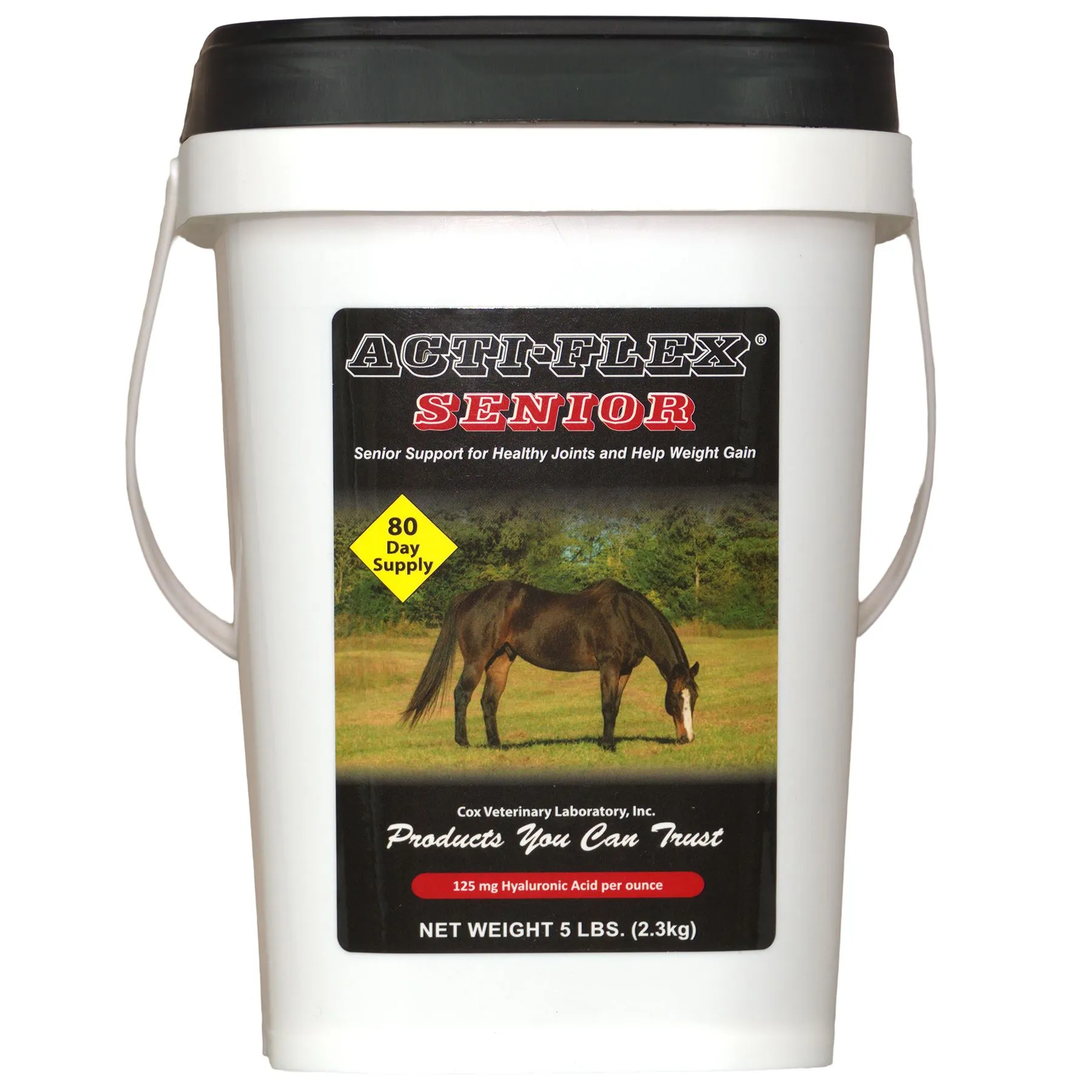 Key substances in Acti-Flex 4000 work together to improve performance by increasing the horse’s supply of joint-lubricating synovial fluid, which repairs and strengthens body parts that running puts under high Acti-Flex Senior is a nutritional supplement specifically formulated for the “old timer” to help them stay flexible, comfortable and maintain a healthy weight. We used the same joint benefiting nutrients in Acti-Flex and combined them in a product for older horses that may have difficulty gaining or maintaining a healthy body weight. Acti-Flex Senior is manufactured in an alfalfa-based powder that proves to be highly palatable. Probiotics are included to help compensate for the reduced digestive efficiency of older horses so the nutrients that are being put in can properly be digested to benefit all vital systems in the equine body.