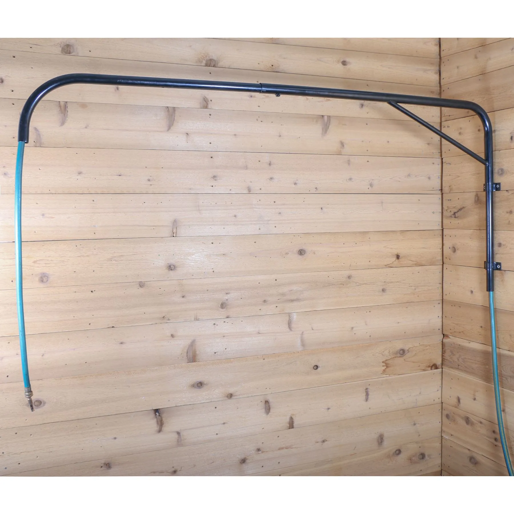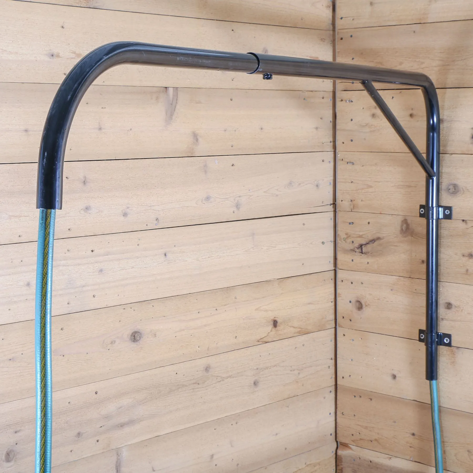 This overhead hose boom mounts easily in wash stalls, has larger diameter tubing to be compatible with all standard size hoses and the boom arm adjusts and extends to meet the dimensions of most wash stalls. The hose boom swivels 180° overhead so the hose in always safely off the ground and user can move to each side of the horse easily.