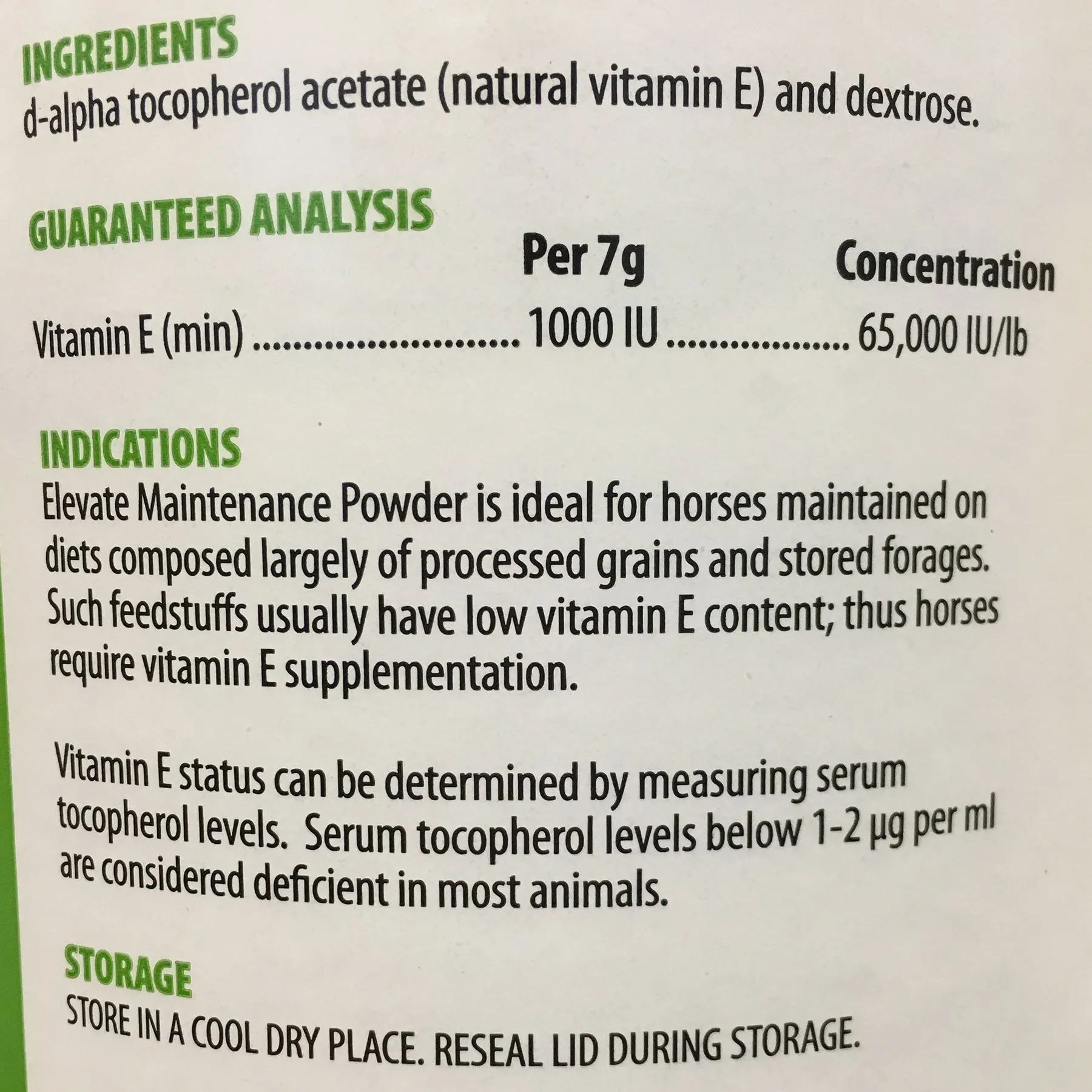 Elevate Maintenance Powder serving instructions:1 scoop = 1,000 IU of vitamin E. Mix in feed.