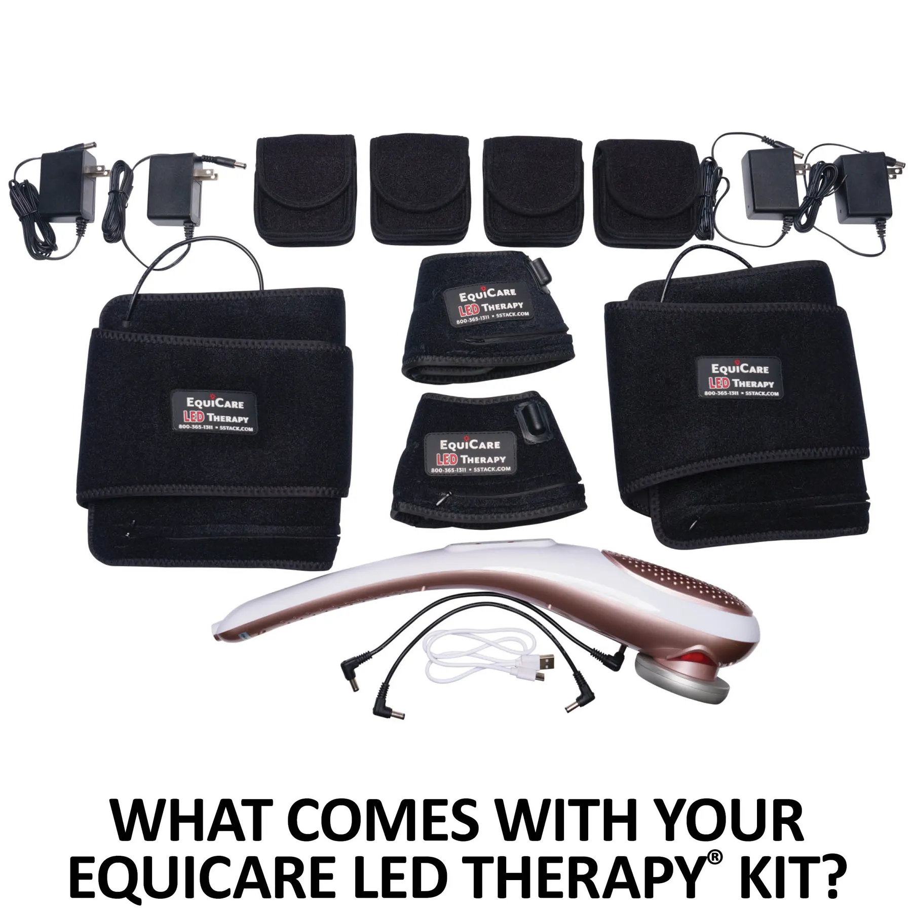 The EquiCare LED Therapy® Wraps, Bell Boots, and Wand Kit is part of our remarkable Red Light Therapy product line that we offer at unbelievable prices for the everyday horseman. The full kit includes (2) medium LED wraps, (2) LED bell boots, and (1) handheld LED wand to treat various areas on your horse’s body, hooves, knees, cannon bones, hocks, neck, stifles, back, etc. It’s perfect for helping prevent, maintain, and treat soft tissue injuries and helping alleviate chronic conditions in horses.