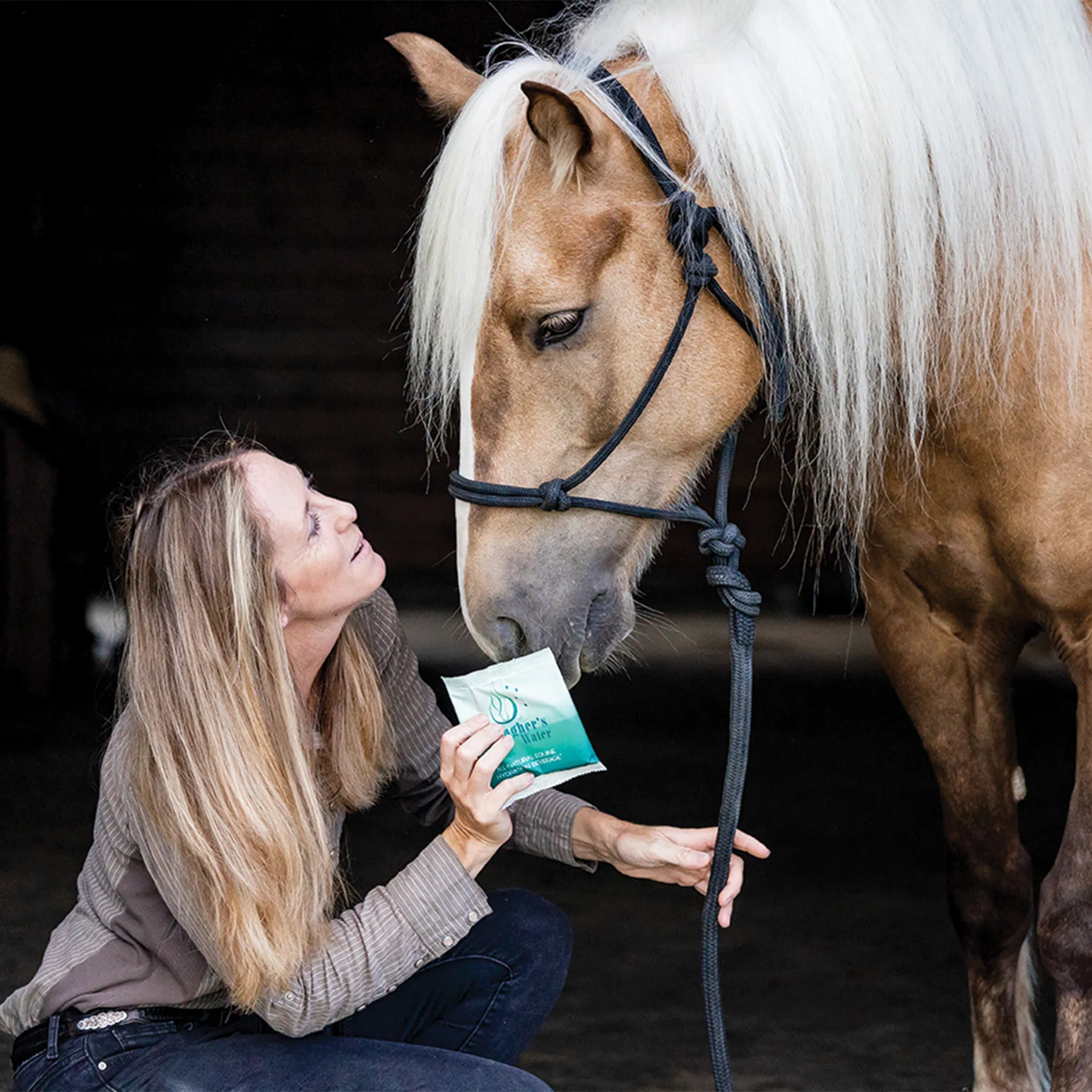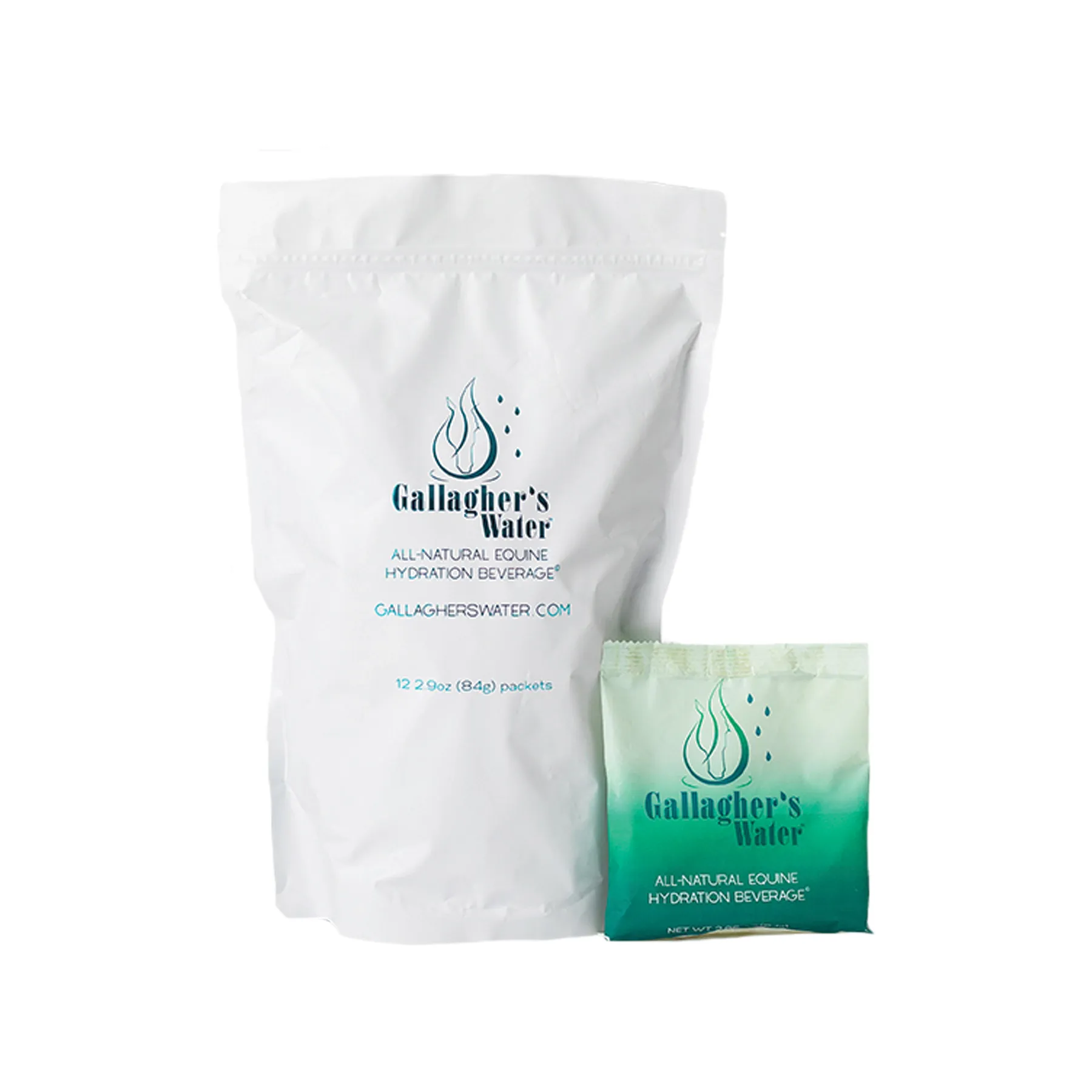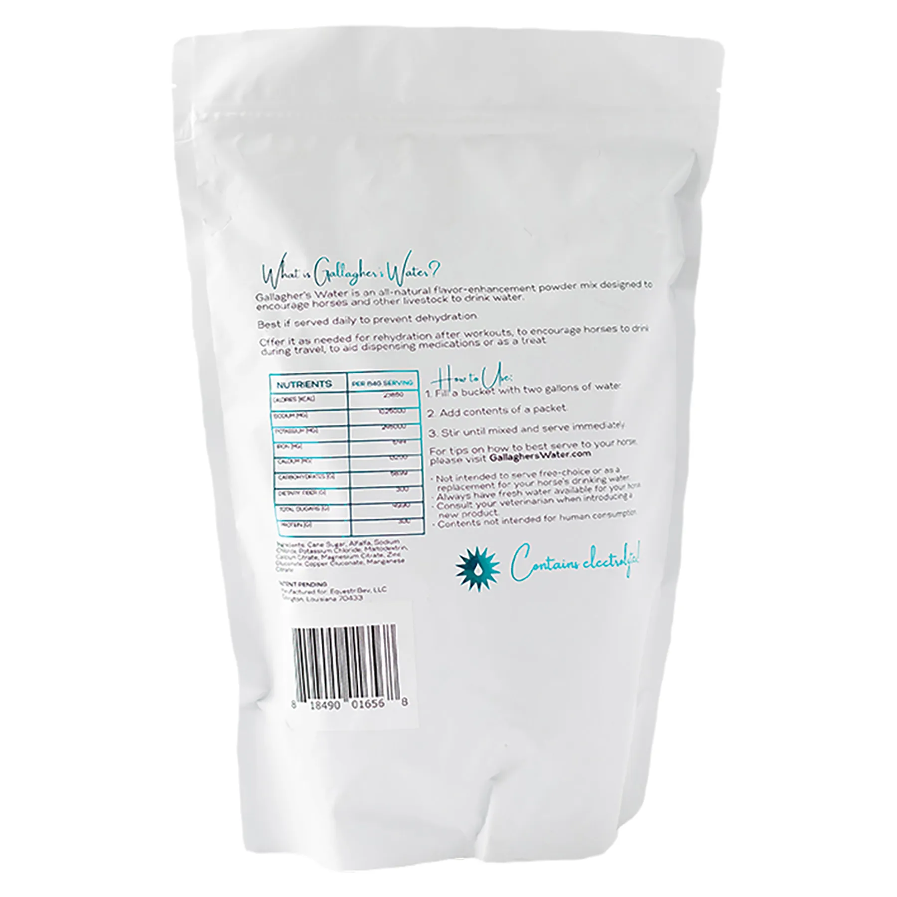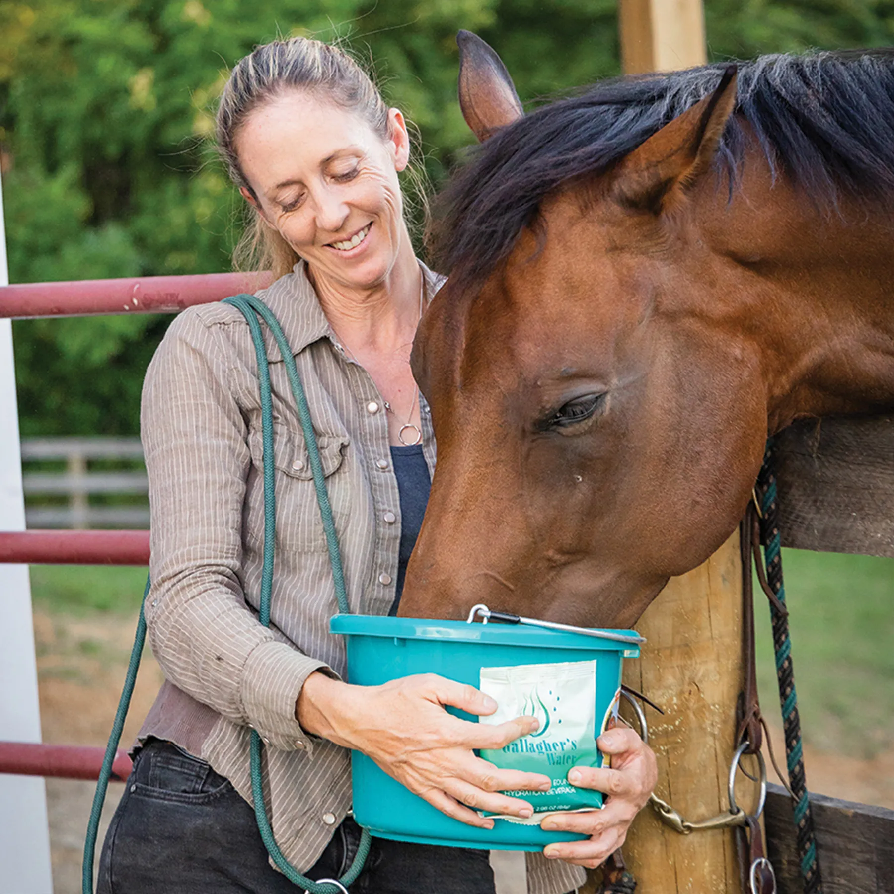 The original, all-natural, hydration beverage for horses! Served daily, Gallagher’s Water helps to ensure your horse is properly hydrated. The alfalfa-flavored electrolyte powder mix transforms your horse’s water into an irresistible treat with benefits. It can be served warm when the temperature drops and is ideal when hauling and traveling or as a workout recovery. Gallagher’s Water is made in the U.S. from premium human-grade ingredients. Each ingredient is micro-tested before being accepted into our inventory and then spot-tested randomly in our warehouse. It is packaged in a commercially sterile environment that the USDA frequently audits. Great care goes into producing the best for your horses and livestock. All-natural equine hydration beverage. A natural flavor enhancement powder mix designed to encourage horses to drink water.