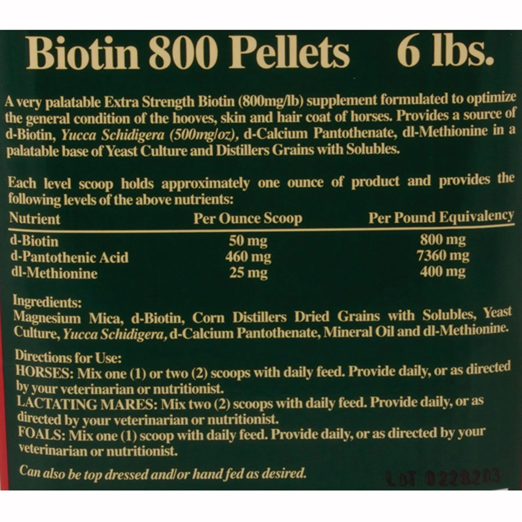 Biotin 800 is a very palatable extra strength Biotin (800 mg/lb) supplement formulated to optimize the general condition of hooves, skin and hair coat of horses. Biotin 800 provides a source of d-Biotin, Yucca Schidigera (500 mg/oz) d-Calcium Panthothenate, dl-Methionine in a palatable base of Yeast Culture and Distillers Grains with Solubles.