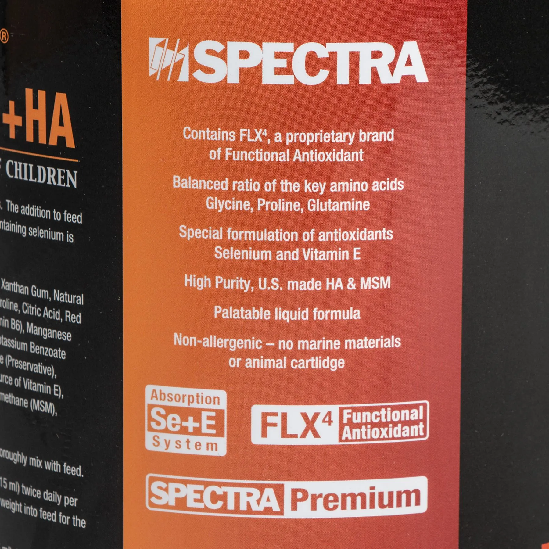 - A patented solution combining Spectra Equine’s proven selenium and vitamin E absorption system for muscle soreness along with premium key nutrients that promote joint health