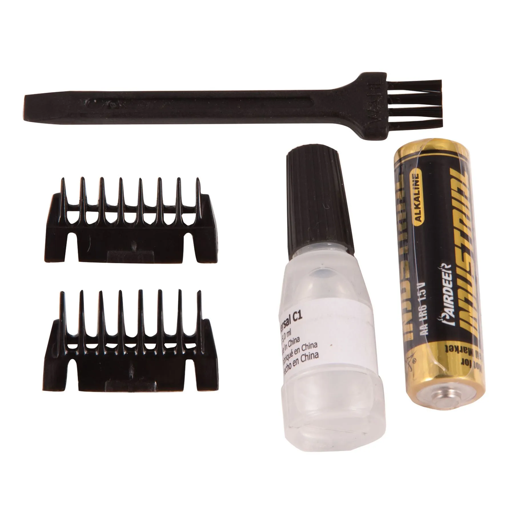 - Includes #40 blade, 2 attachment combs, cleaning brush, blade guard, trimmer oil and 1 AA battery